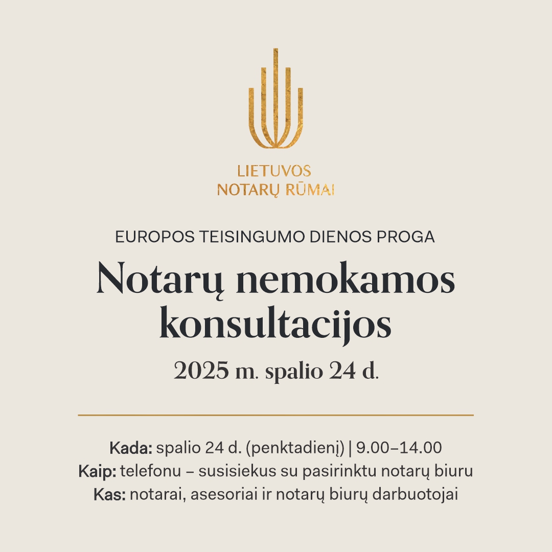 Konsultacijos vyks spalio 24 dieną (penktadienį) nuo 9 iki 14 val. telefonu, paskambinus į bet kurį notarų biurą Lietuvoje.